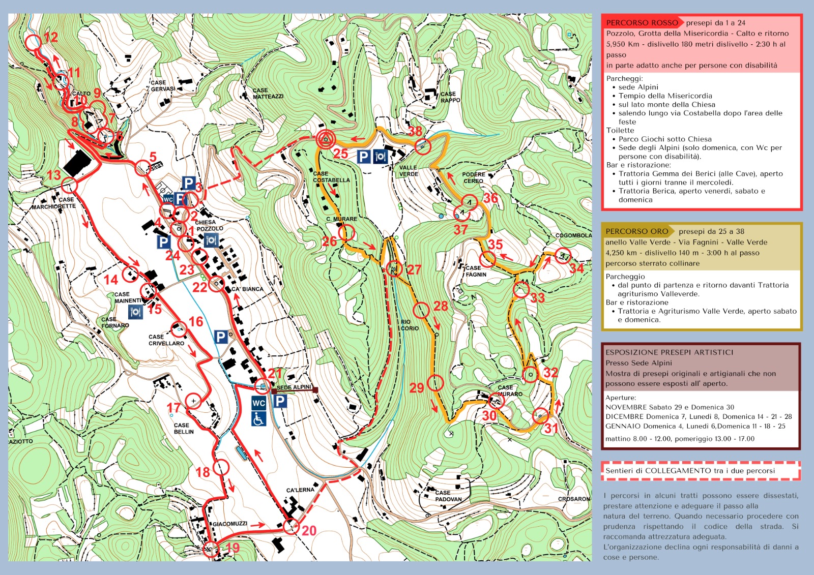 Ore 14.00: ritrovo al punto di partenza sotto la Chiesa di Pozzolo e partenza per la visita guidata di 24 presepi presenti lungo il percorso rosso.