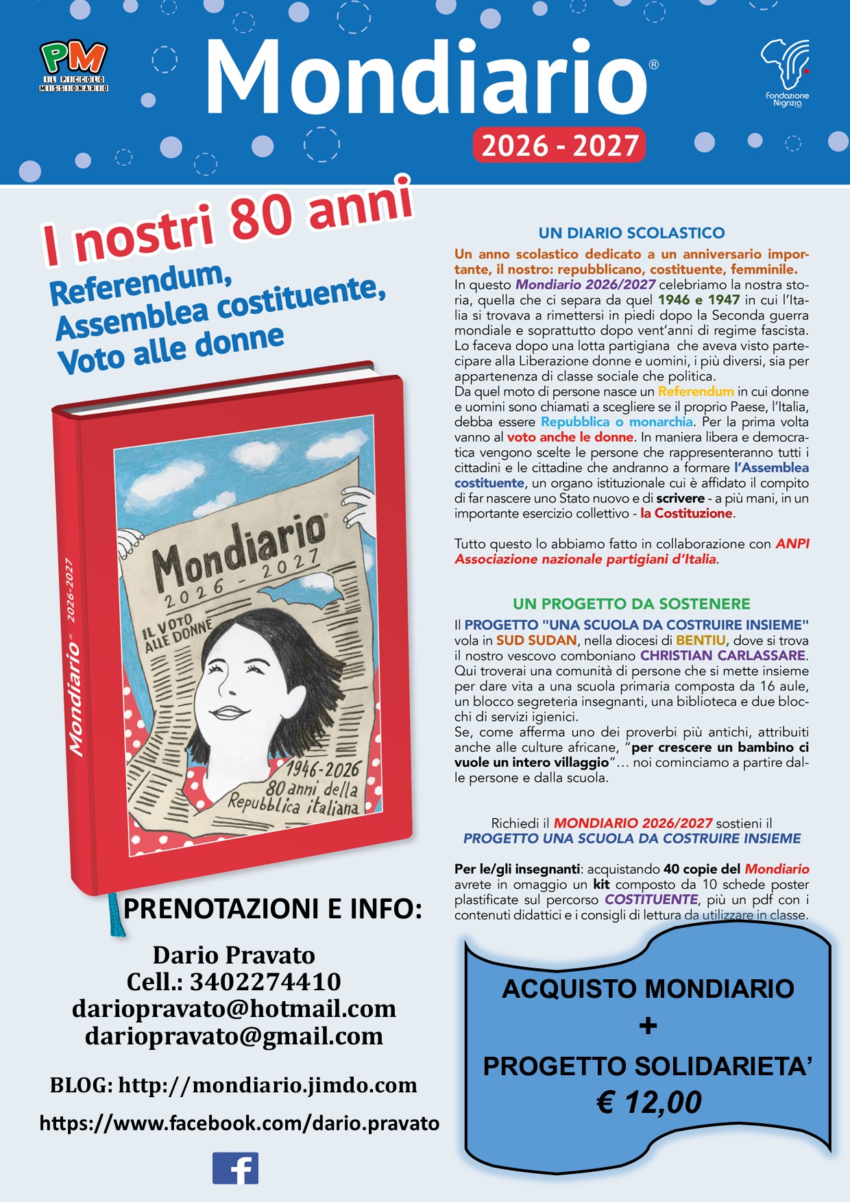 E ancora, ricordiamo che il Mondiario non ha finalità di lucro e, pur avendo un costo di produzione, è un’iniziativa didattica/educativa e solidale. Inoltre, teniamo a precisare che il Mondiario non ha uno scopo confessionale e in nessun modo c’è l’obbligo di acquisizione. È una libera proposta, in alternativa alle tante proposte commerciali.